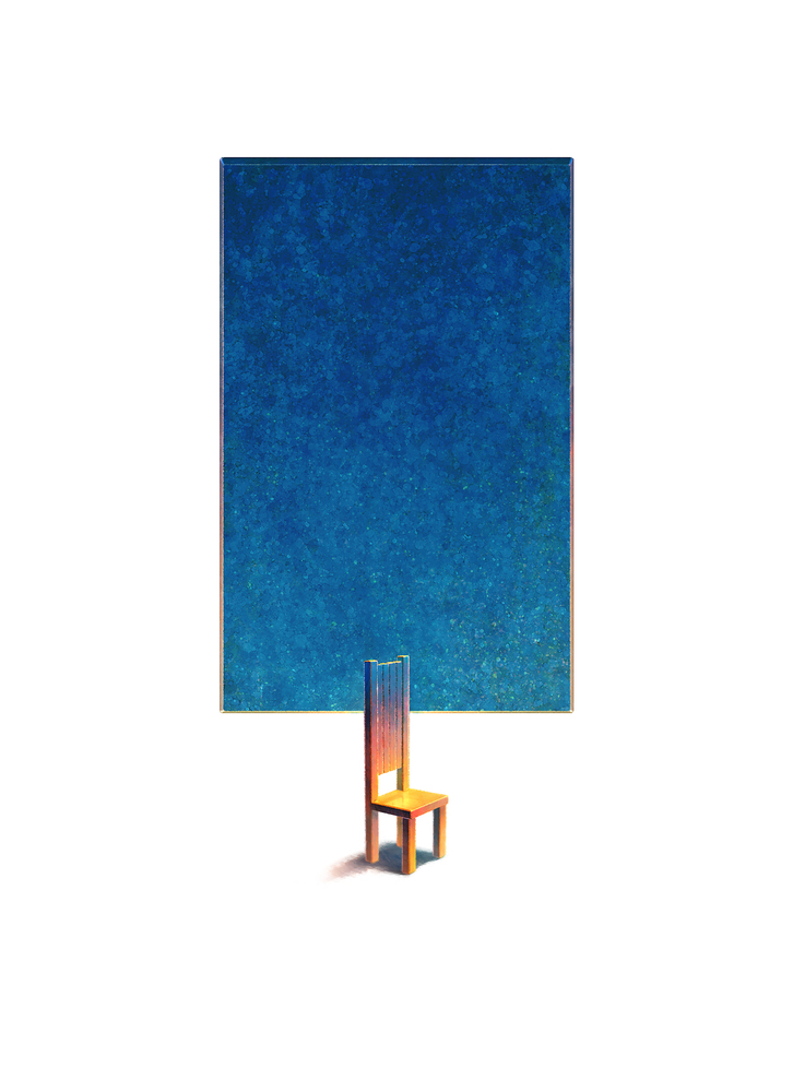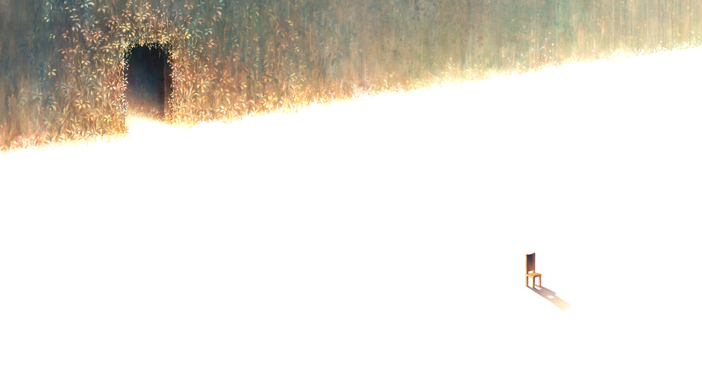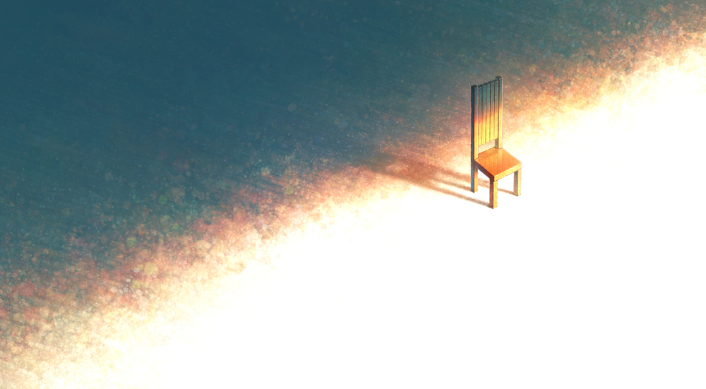 人物を直接描かず、人の存在や痕跡を表すモチーフとして椅子を描いています。
